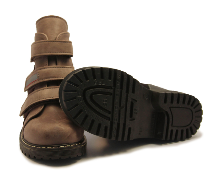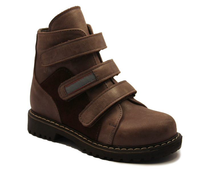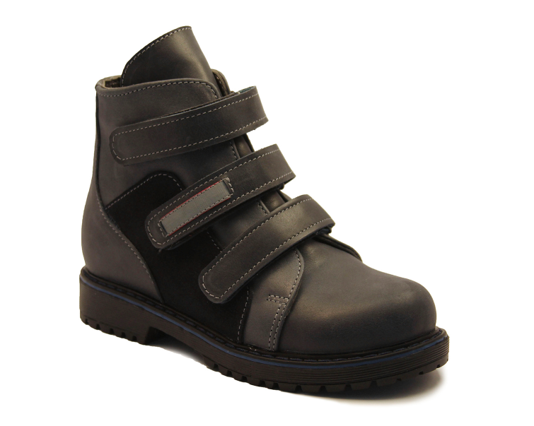 Каблук Томаса. Декор из замши и текстиля. В базовом комплекте съемная ортопедическая профилактическая стелька. Возможна комплектация плосковальгусной или варусной стелькой. Жесткий высокий задник, удлиненные берцы, жесткий подносок. Может использоваться в качестве лечебной, лечебно-профилактической или профилактической обуви. Три крепежных липучки обеспечивают плотную фиксацию стопы.